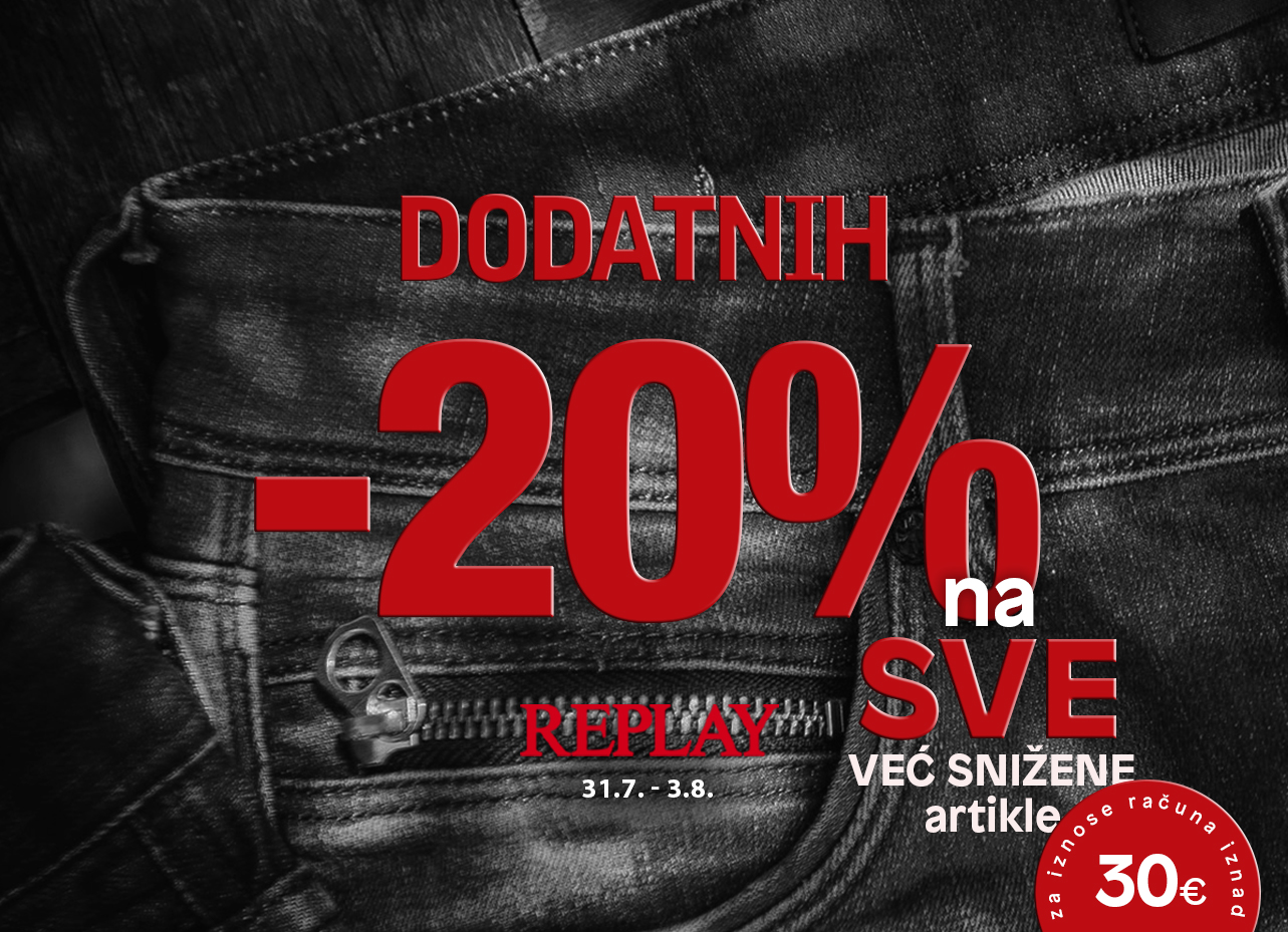 Iskoristite dodatnih 20% popusta na sve artikle iz Finalne akcije koji su već sniženi 50% u trgovini Replay u Jokeru. Akcija traje od 31.7. do 3.8. i odnosi na iznose računa iznad 30€.
